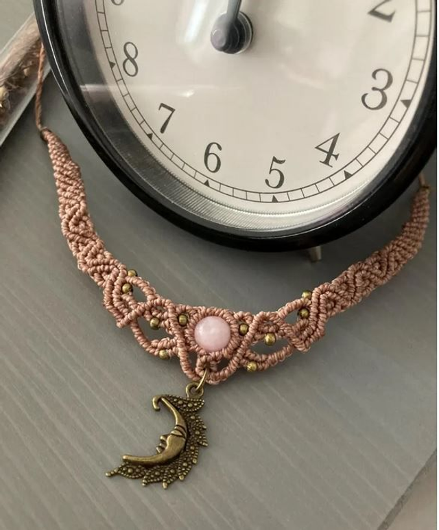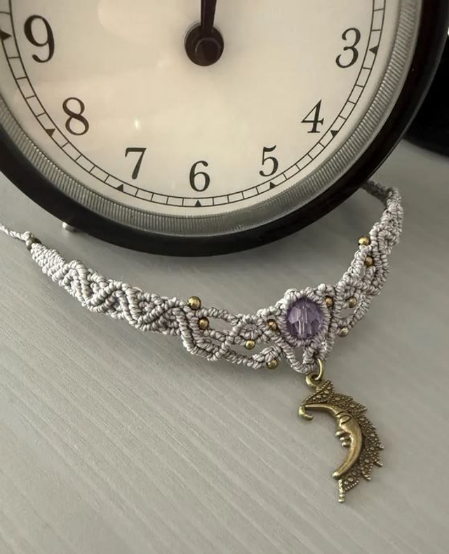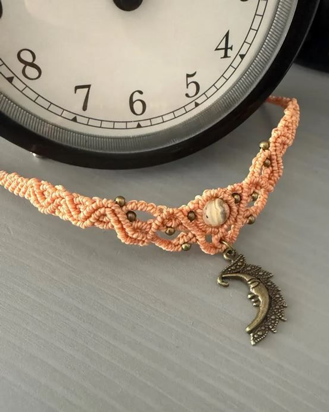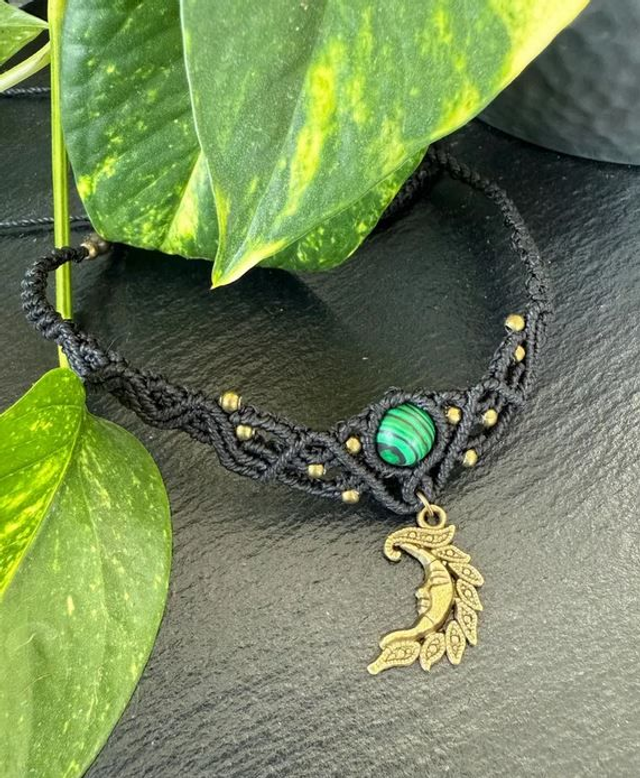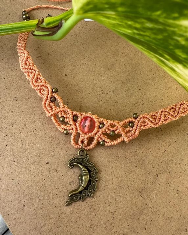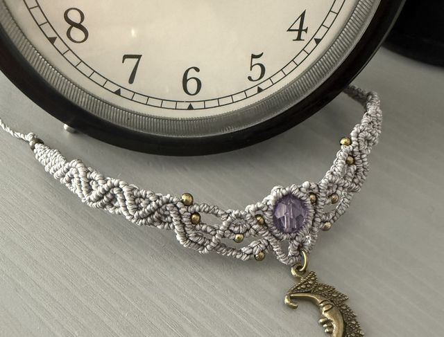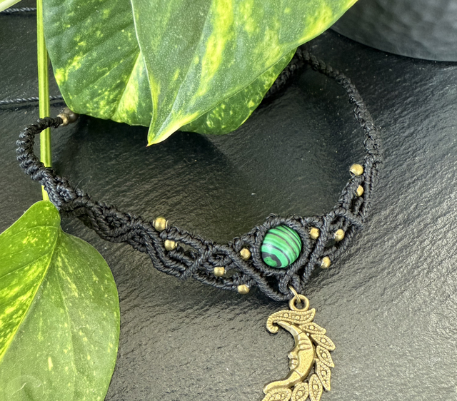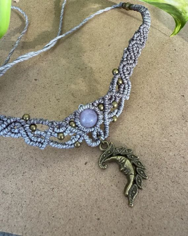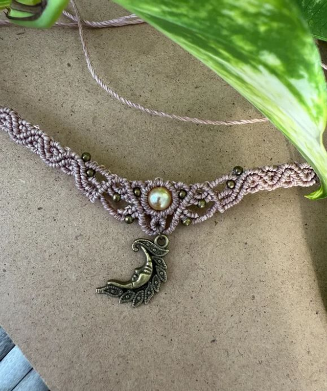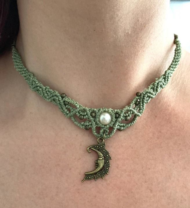 Filigraner Choker aus Linhasitagarn mit großer Perle in der Mitte und Mond-Charm. Die Länge ist verstellbar.