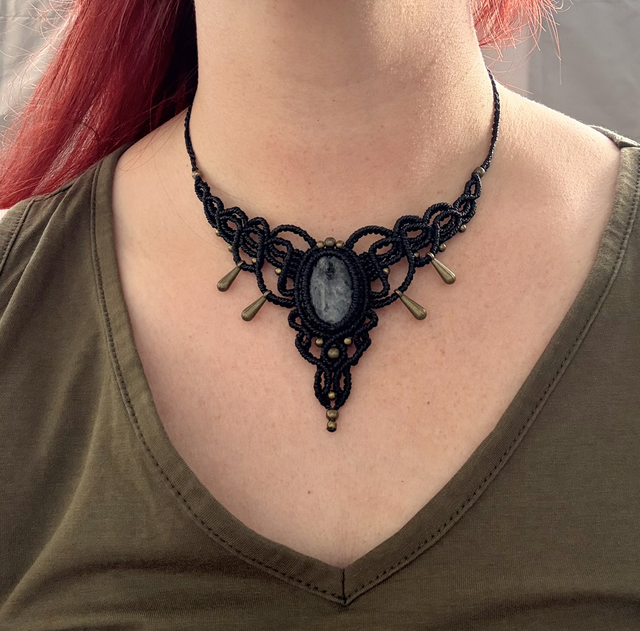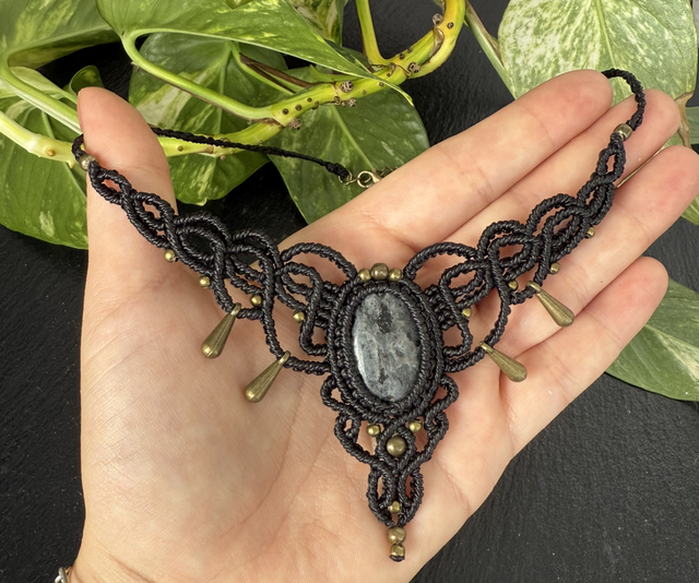 Schwarze Halskette mit Perlen und Picasso Jaspis Edelstein. Schließt mit Karabiner.